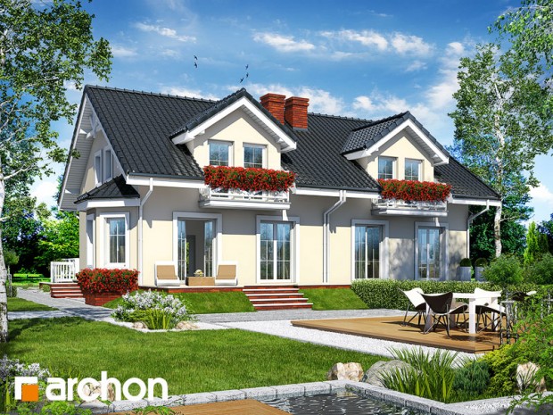 Projekat – kuća sa neobičnim krovom sa ukrašenim balkonom